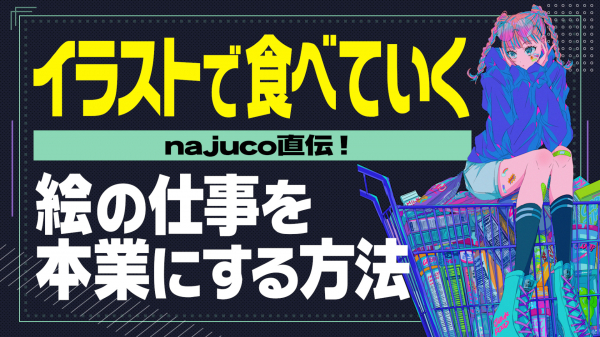動画教材は「イラストレーションで食べていく」をテーマに『絵で稼ぐため』に必要なコトを学べる内容で、プロのイラストレーターを目指す方向けの教材になっています。講師を務めるのはゆるく、かわいく、だらしなくをテーマとしてポップでカワイイ作品を描く人気イラストレーターnajucoさん。