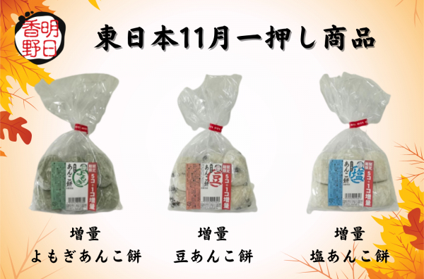 以下のあんこ餅各種は11月1日から11月30日までの期間限定品で、1個増量中の商品です。