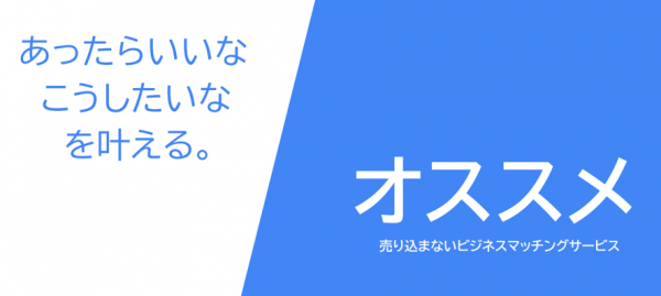 オススメは、“売り込まないビジネスマッチングサービス”をコンセプトに、企業の「あったらいいな。こうしたらいいな。」を叶えるときに、それを叶える企業をオススメするリファラルビジネスマッチングサービスです。