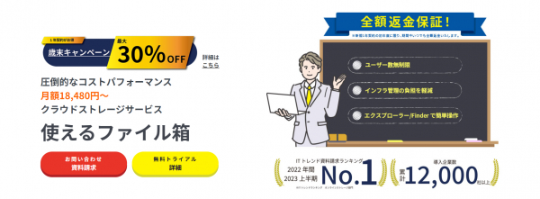 2023年11月7日 - クラウドサービスを提供する使えるねっと株式会社(本社:長野県長野市)は、2023年12月27日(水)まで歳末キャンペーンを実施します。使えるねっとの人気商品「使えるファイル箱」を期間中に1年契約で申し込むと、初年度の料金が最大30%割引になります。クラウドストレージの新規導入や乗り換えをご検討中の方は、このチャンスに是非お申し込みください。