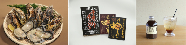 寄島牡蠣、ひめのもち、フルーツジャム、千屋牛ラーメン、千屋牛スパイスカレー、瀬戸内産ハモ、マルベリー加工品、干し柿、クラフトコーラ、地紅茶、地酒など、選りすぐりの特産品の試食と購入ができます。