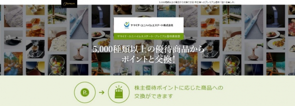 対象となる株主様の保有株式数に応じてポイントを贈呈いたします。そのポイントを株主様限定の特設ウェブサイト「ヤマイチ・ユニハイムエステート・プレミアム優待倶楽部」において、お米やブランド牛などのこだわりグルメ、スイーツや飲料類、銘酒、家電製品、選べる体験ギフト等、5,000 種類以上の商品からお好みの商品をお選びいただけます。