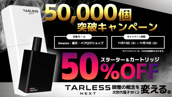 株式会社ドロームは、喫煙の概念を変える。次世代の電子タバコ「TARLESS NEXT(ターレスネクスト)」の累計販売5万台突破を記念して、11月13日より「TARLESS NEXT5万個突破キャンペーン」と題して、Amazon,楽天市場,ベプログショップでTARLESS NEXTスターターセット,カートリッジが50%OFFのキャンペーンを開始。