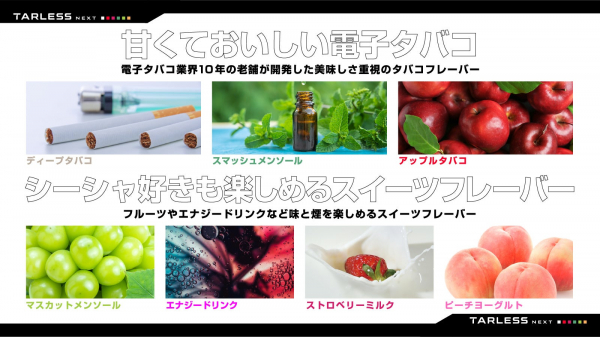 喫煙者にとっては衝撃の『甘くて美味しいタバコフレーバー』、シーシャ好きにとっては大満足の『スイーツフレーバー』を採用。