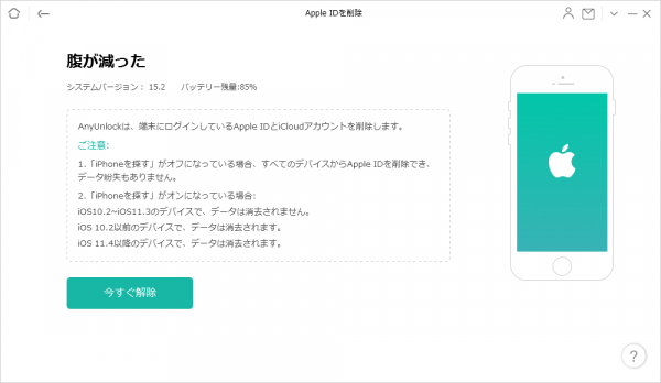 ステップ3.iPhoneを接続してください。デバイスが認識されたら、「今すぐ解除」をクリックしてApple IDのロックを解除してください。