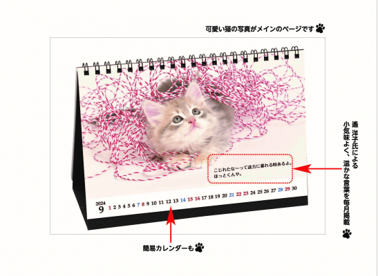 犬猫に特化したフォトサービスを提供する株式会社トップオブハート(所在地:東京都新宿区)は、2023年11月16日より、『猫様のお言葉 ・第II章』2024年版卓上カレンダーの販売を開始しました。2016年より8年間発行している『猫様のお言葉』卓上カレンダーは、2023年版より第2章となり、作家でタレントの遙洋子氏にお言葉をご担当いただいています。撮影セットの中で走り回って遊ぶ子猫たちの絶妙な自由演技で、今年もほっこりポーズが撮れました。一年を通していつも側にあるものだからこそ、大人可愛いデザインで、お部屋のインテリアとしてもお洒落にご利用いただけます。上手くいく日も、いかない日も、子猫たちに癒され、 励まされ、隠れニャンコや星占いで、使って楽しい宝箱のようなカレンダーです。