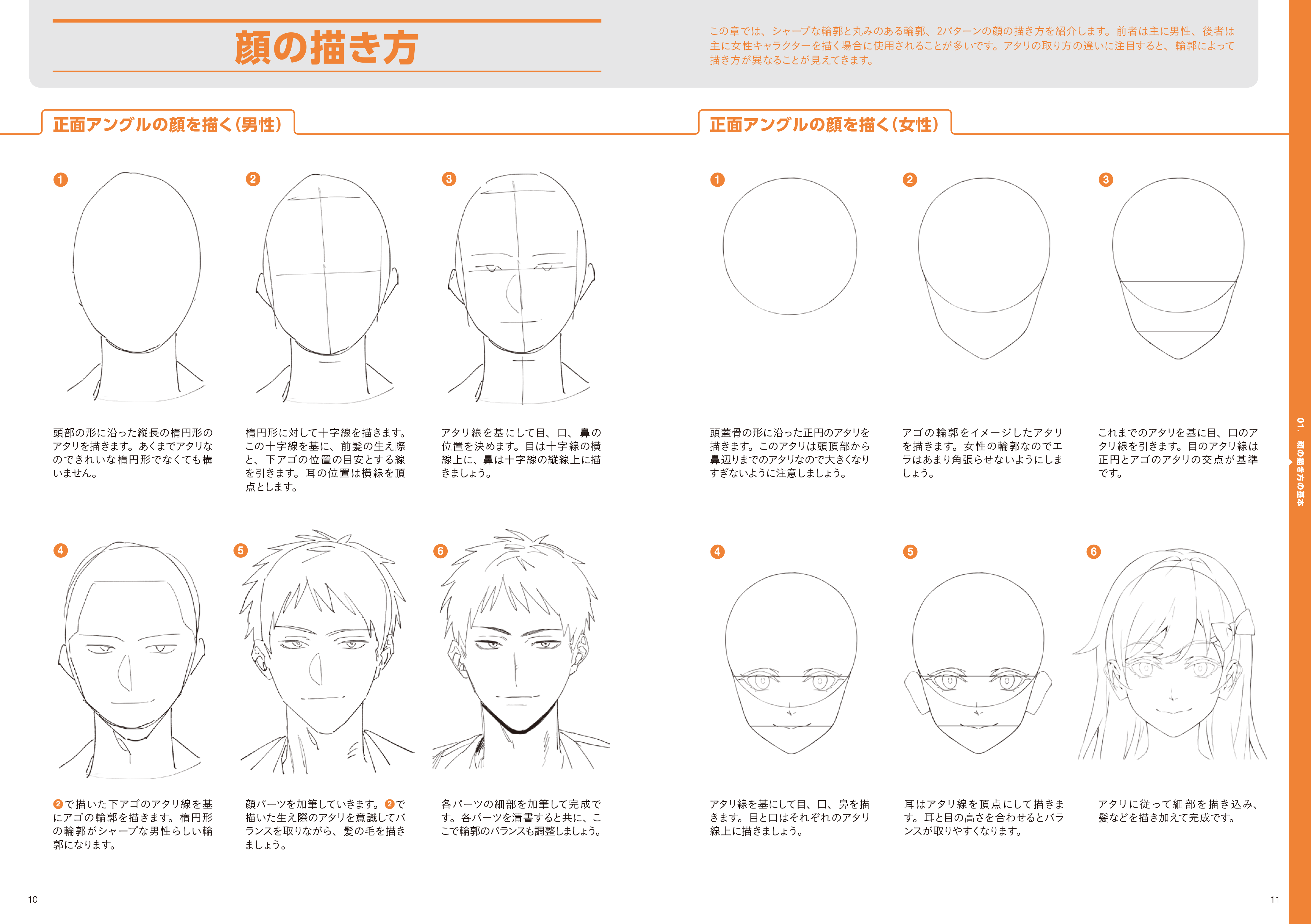 もちろん真正面をふくめた基本的な顔の描き方についても簡単なレクチャーを併載。