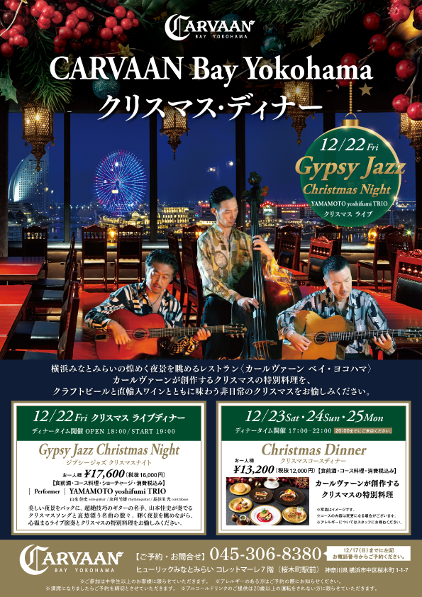横浜みなとみらいの美しい夜景をバックに、超絶技巧のギターの名手、山本佳史が奏でるクリスマスソングと哀愁漂う名曲の数々。今年のクリスマスは、輝く夜景を眺めながら、心温まるライブ演奏とCARVAANが創作するクリスマスの特別料理をお愉しみください。