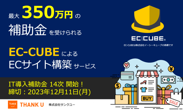 株式会社サンクユー(東京都品川区、代表取締役社長:堀川治)は、2023年11月13日、最大350万円のIT導入補助金の交付申請が可能な「EC-CUBEによるECサイト構築」14次締切分を開始いたします。
