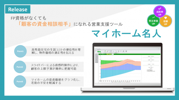 株式会社エフピー研究所は(本社:東京都文京区、代表取締役:石田さつき)、2023年12月5日、FP資格がなくても「顧客の資金相談相手」となり、住宅価格高騰による資金面の不安解消やランニングコスト等から住宅の高性能化に納得感を生み出す営業支援ソフト「マイホーム名人」を発売します。