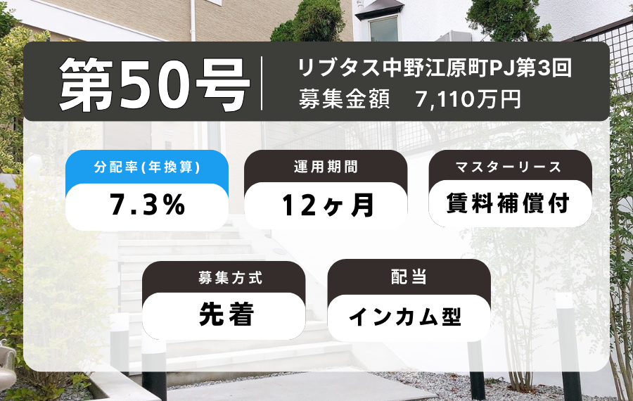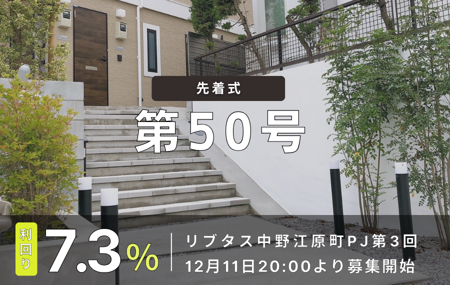 「利回り不動産 第50号リブタス中野江原町PJ第3回」の募集は、2023年12月11日(月)20時より先着順で開始されます。ぜひご期待ください。