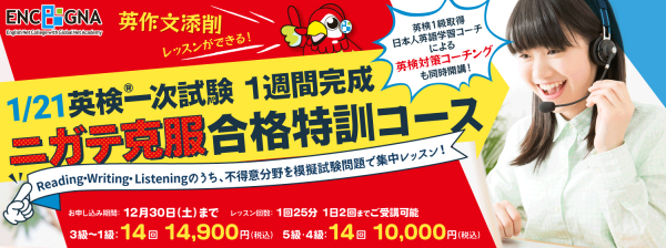 ENC/GNAでは「英検(R)一次試験 直前1週間 ニガテ克服合格特訓コース」を開講いたします。