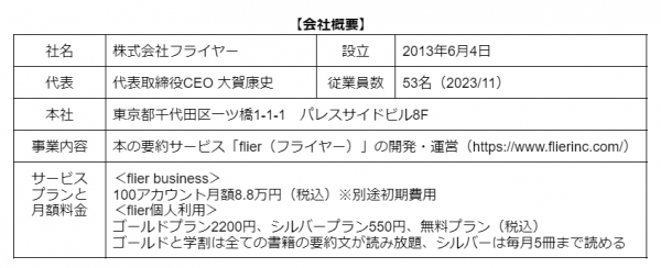 株式会社フライヤーは、本の要約サービス「flier(フライヤー)」を運営する、ITベンチャー(2013年6月設立)です。最大の特長は「書評(レビュー)」ではなく「要約」である点です。書き手の主観が入る書評とは異なり、著者の主張や論理(重要ポイントや全体像)を忠実にまとめ、読者に伝えます。書評でないため、出版社と著者から要約の許可を得る必要があり、要約した原稿にも目を通していただくことで、高品質なサービスを提供しています。