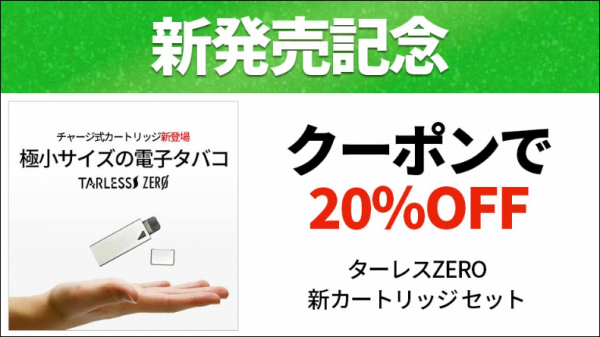 極小のライターサイズなのに濃厚な吸い応えの新商品 TARLESS ZEROに使える20%OFFクーポン発行中!