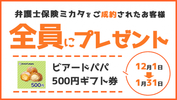 対象期間中に弁護士保険STATION経由で、ミカタ少額短期保険株式会社「弁護士保険ミカタ」の契約申込を完了し、ご契約が成立されたお客様全員に、「ビアードパパ 500円ギフト券」をプレゼントします。