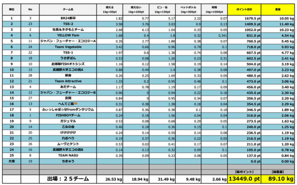 開催当日は1時間という短い時間にも関わらず、総重量89.10kgものゴミを回収することができました。渋谷区では2023年度、4月~10月の累計58,111tものゴミが回収されています。※2参加した25チームが、渋谷区の指定範囲内において積極的に競技に参加いただいたことで、当社の想い入れのある渋谷区内のクリーンアップに、微力ながら貢献ができたことを誇りに思います。