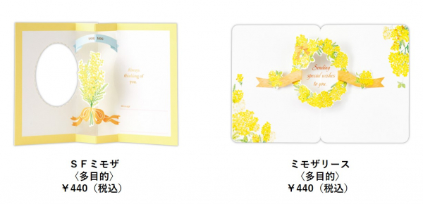 女性の生き方を考える「国際女性デー(ミモザの日)」のシンボルとして、近年注目が集まっているミモザのデザインが仲間入り。カードを開くとミモザのブーケやリースがポップアップします。