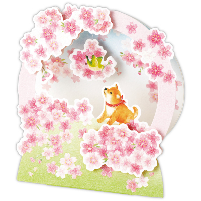 人気の桜×動物モチーフに新柄が登場。リース型の機構で幻想的な桜の風景を表現しました。メジロと柴犬が可愛らしいポイントです。