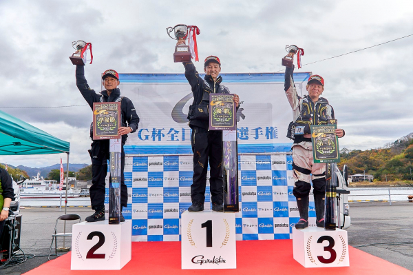 決勝戦は中司選手と過去2度G杯チャンピオンの座に付いている幸森選手の対戦。舞台は風裏になる養殖場1番。際や沖目を探ったり、試行錯誤の釣りが展開されたが、水温が高い影響かイスズミやアイゴ、スズメダイ系などのエサ取りが活発でグレの食いは渋く、釣果を得ることはできなかった。結果は0対0で終え、規定により前試合(準決勝)の釣果が上回る中司選手が優勝となった。試合終了直後は少し実感が湧かない様子の中司選手だったが、表彰式後は「これまでの苦労や悔しい経験がここで実ってよかったです」と喜びを話してくれた。