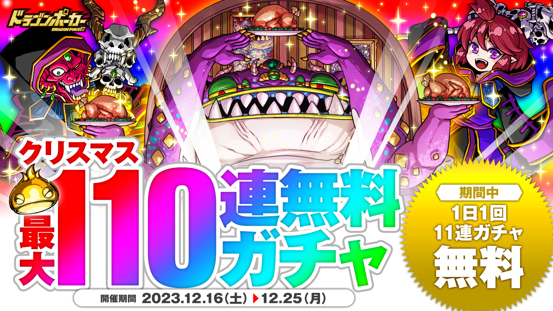 12月16日(土)より、「クリスマスキャンペーン」と称してゲーム内で2つのキャンペーンをお届けいたします。1日1回無料で11連が引ける「クリスマス最大110連無料ガチャ」、「女王サンタフェアリー」や「SSレアガチャチケット1枚」などがもらえる「クリスマスログインキャンペーン」を開催いたします。『ドラゴンポーカー』のクリスマスをお楽しみください!