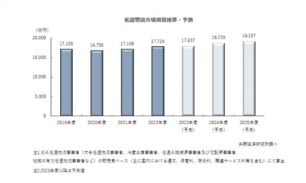 2023年度の低温物流市場規模は、日系低温物流事業者の国内における販売高ベースで、前年度比1.2%増の1兆7,937億円と予測する。