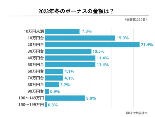 今年の冬のボーナスが出る見込みの男女220人に、ボーナス支給額(税込み金額)を聞いてみると、もっとも多かったのは「20万円台」で全体の21.4%、平均額は44万5909円でした。