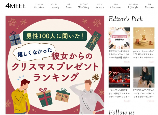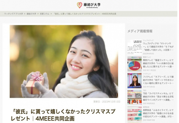 『4MEEE』では、女性読者に向けて「彼女に貰って嬉しくなかったクリスマスプレゼント」を掲載。『縁結び大学』で調査したアンケート内容を元に、嬉しくなかったプレゼントの種類やその理由、受け取った時のリアクションなどをコンテンツ化しています。