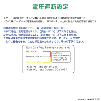 PAPAGO JAPAN株式会社は「スマート常時電源ケーブルSEVEN」を2023年12月21日(木)から発売します。USB Type-Cコネクタを持つ5V/1Aから最大3Aまでのドライブレコーダー専用常時電源ケーブルです。常時、ACC、アースに3芯接続します。車のエンジンが稼働していない状態でもドライブレコーダーのために電源を供給できます。カーバッテリーの電圧が低い時にドライブレコーダーへの電源供給を遮断する機能でバッテリー上がり防止にも対応(※1/2/3)電源遮断設定時のディップスイッチを省いたスマートタイプの電源ケーブルです。詳しくは製品情報をご覧ください。