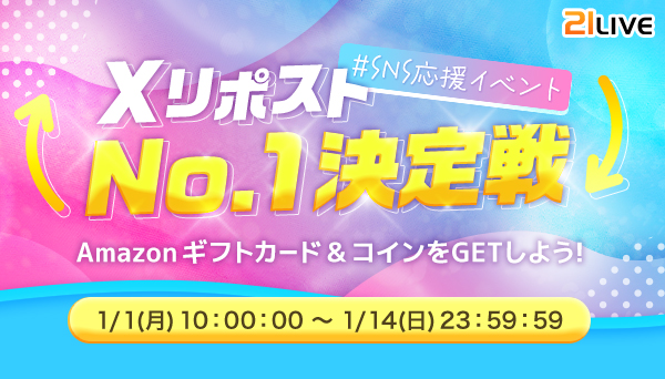 株式会社エムアンドティーティー(本社:沖縄県北谷町、代表取締役:井藤 三知子)が運営するエンターテイメント・ライブ配信アプリ【21LIVE(ニーイチライブ)】URL: https://21.live では、1月1日(月)よりXでのリポスト数を競うイベントを開催中。1位を獲得したライバーには、20,000円分のアマゾンギフト券をプレゼントいたします。