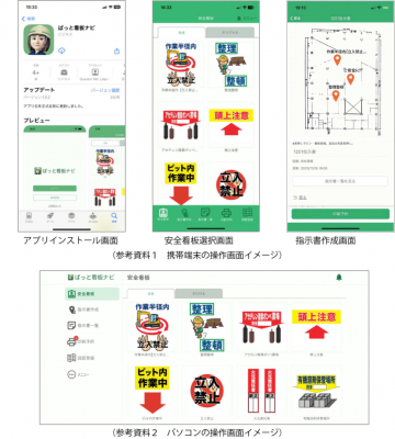 本アプリは、建設現場を巡回中に携帯端末から必要な安全看板とその設置場所を簡単に選択指示でき、パソコンを使わず直接印刷できるため、現場技術者の安全看板設置にかかる業務の省力化を実現します。また、安全看板はアプリ内の指示書に表示されるため、設置忘れを防ぐことができ安全な現場運営に貢献します。