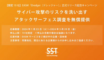 安全なWebサイトを実現するために脆弱性診断とクラウド型WAFを提供する株式会社セキュアスカイ・テクノロジー(本社:東京都千代田区、代表取締役:大木 元 以下、SST)は、国産EASM*1クラウドサービス「Dredger(ドレッジャー)」の正式リリースを記念して、2024年1月23日より、限定10社を対象としたアタックサーフェス(Attack Surface)*2調査を無料で提供するキャンペーンを開始いたします。