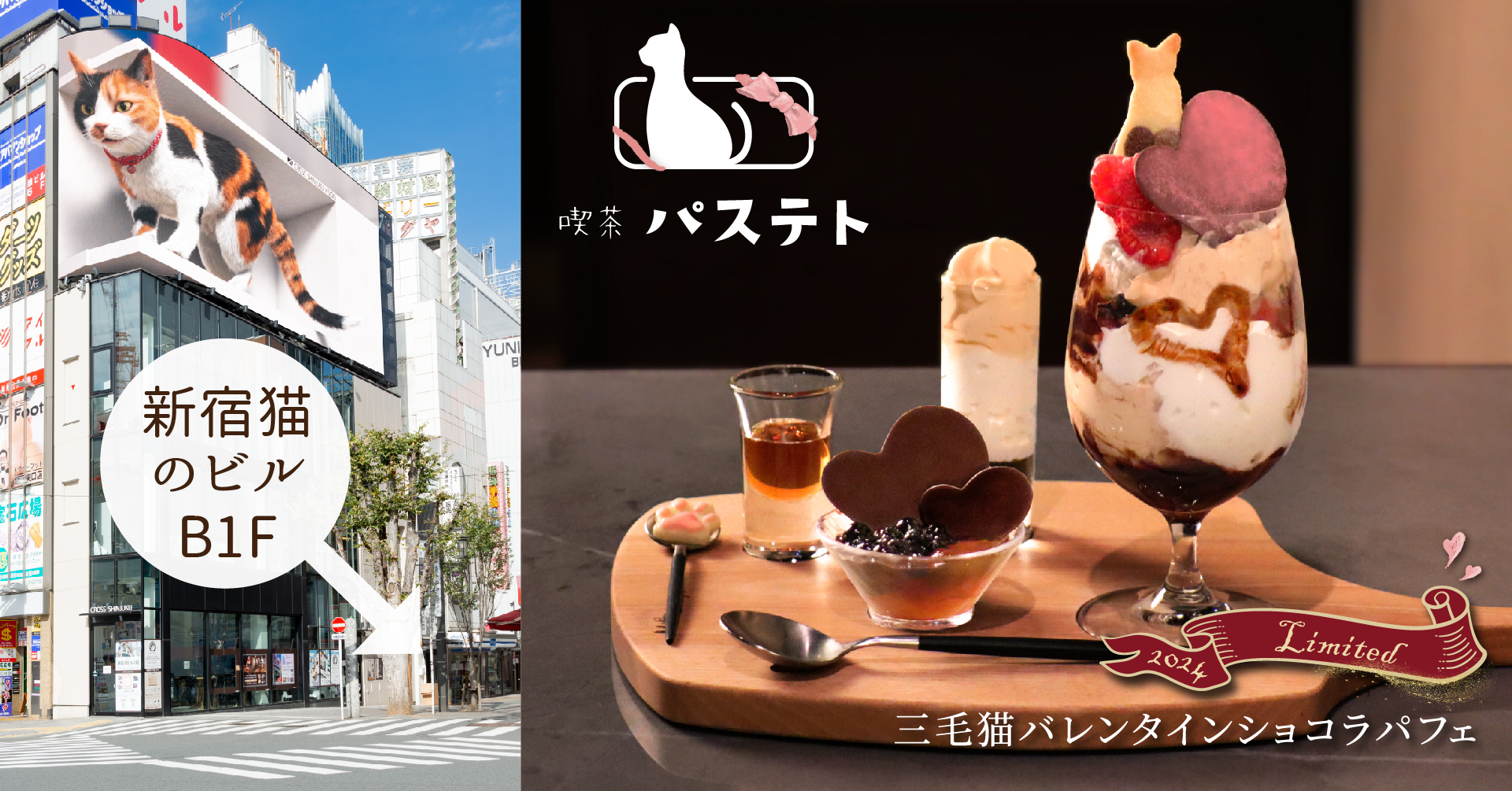 株式会社アズフードシステムズ(本社:東京都中央区、代表取締役:森田威)が運営する、新宿駅東口すぐの喫茶店「喫茶 パステト」は、人気商品『三毛猫ショコラパフェ』をバレンタイン仕様にした『三毛猫バレンタインショコラパフェ』を、2024年1月23日(火)より2月14日(水)まで期間限定発売いたします。