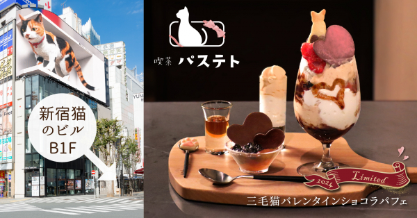 クロス新宿ビジョンから飛び出る“3D巨大猫”をモチーフにし、大好評いただいている『三毛猫ショコラパフェ』が、バレンタインシーズンだけのスペシャルバージョンになりました。
