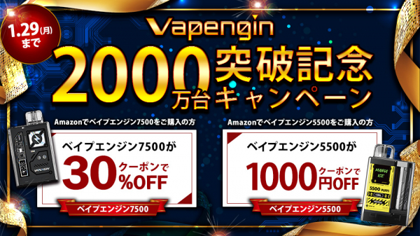 株式会社ドローム(本社:千葉県柏市)が運営するAmazonベプログショップは1月26日(金)00:00~1月29日(月)23:59まで持ち運びシーシャVapengin(ベイプエンジン)が世界で2,000万個販売突破を記念してAmazonベプログショップでキャンペーンを開始します!更に5500で大人気だったフレーバー「レモンコーラ」も7500でAmazonで同時に復刻販売を開始します!