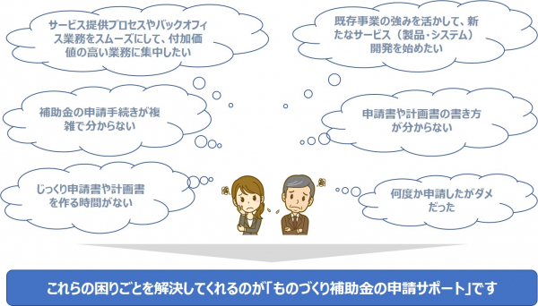 弊社の申請サポートは、補助金申請にかかる煩雑な業務を軽減することで、課題解決に向けた積極的な投資が実現できるサービスです。