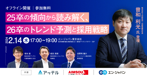 採用支援コンサルティング事業を手掛ける株式会社エイムソウル(本社:東京都台東区、代表取締役:稲垣 隆司)は、2024年2月14日(水)に、株式会社アッテル、エン・ジャパン株式会社と3社合同で無料セミナーを実施します。本セミナーでは、人材研究所の曽和利光氏をお迎えし、26卒採用早期動き出しに向けて陥りがちな失敗とその解決策についてご紹介いたします。