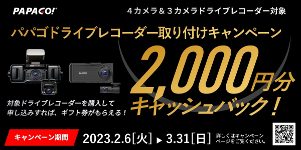 ドライブレコーダー製品の製造販売事業を展開するPAPAGO JAPAN株式会社(所在地:埼玉県川口市)は、対象ドライブレコーダー購入するとギフト券2000円分がもらえる!「パパゴドライブレコーダー取り付けキャンペーン」を2024年2月6日(火)から3月31日(日)まで開催します。貴方のクルマのドライブレコーダーは、ちゃんと映像を録画していますか? 万が一の時を記録する車載カメラなので、この機会に1度確認してみてはいかがでしょうか。また、1カメラや2カメラでは撮影できない、当て逃げ、ドアパンチ、側面衝突など、ぶつかった「その瞬間」を記録できる3カメラ、4カメラドライブレコーダーが人気です。取付方法も2カメラと同じ、とっても簡単!歪みの無い映像をしっかり記録して、安心して運転に集中しましょう。詳しい内容はキャンペーンページをご覧いただき、みなさまの応募をお待ちしております!