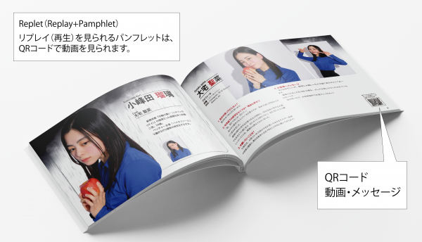 「リプレット」はただの舞台公演パンフレットではなく、出演者のプロフィールや稽古場の写真を楽しみながら、ページに添えられたQRコードから、出演者のメッセージ、主題歌や伴奏音楽、ゲネプロの模様までを自分のスマホで再生することができる。動画連動型パンフレットとなっており、観劇後のプレイバックイメージをサポートする。