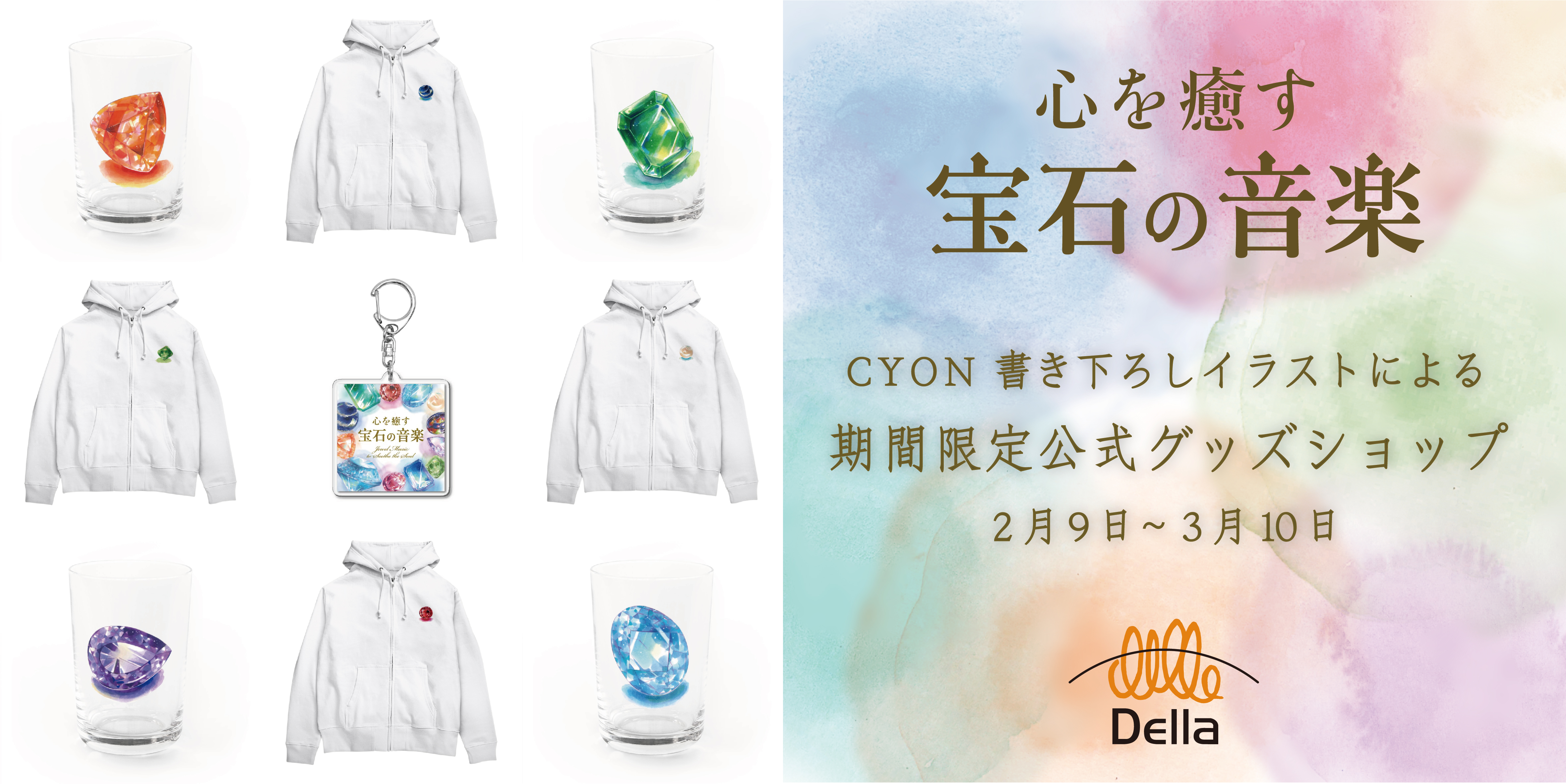 2023年2月に株式会社デラより発売したCD『心を癒す宝石の音楽』のために、コピックアワード2021準グランプリ等を受賞して注目を集めるアーティストCYONが書き下ろした12の誕生石(宝石)のイラストならびに、ジャケット画像を使用した公式グッズショップを、オリジナルグッズ作成・販売プラットフォーム「SUZURI」内に、2024年2月9日(金)~3月10日(日)の間、期間限定でオープン致します。