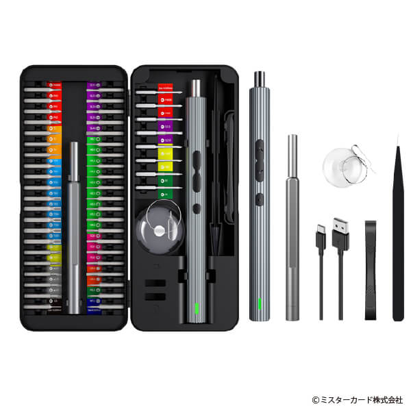 ミスターカード株式会社(本社所在地:埼玉県川口市)は、作業効率化と繊細な作業別に使い分けることができて、とっても便利な電動と手動ハンドルセットの 「58in1電動&手動ドライバー」を2024年2月16日(金)から発売いたします。50種類のビットと8つのパーツを備えた電動ドライバー&手動ドライバーのセットです。作業効率を高める電動ハンドルは高耐久軽量のアルミ合金ボディを採用、正回転・逆回転、3つのLEDライトで照らし、200rpmのパワー、約400回使用できます。細かいネジの締め付けなど繊細な作業には手動ハンドルを利用できます。精密ドライバーには、マグネット化してネジの紛失防止や消磁できるマグネタイザー機能や180度開閉する収納ケースなど特長もあります。いろいろな機器で使用できる精密ドライバーセットが1台あるととっても便利です。
