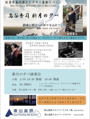 三神(株式会社ゴッドワールドエンターテインメント所属)のギタリスト高谷秀司が能登半島地震チャリティー音楽イベントとして2月10日車山高原スキー場TOPS360にて~「新月の夕べ演奏会」鎮魂と明日への祈りを込めて~を開催しました。