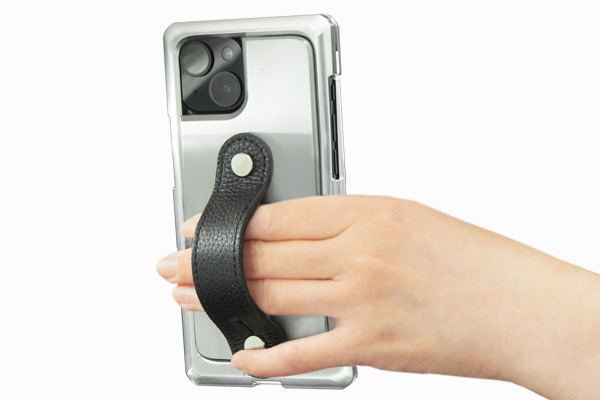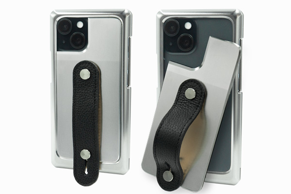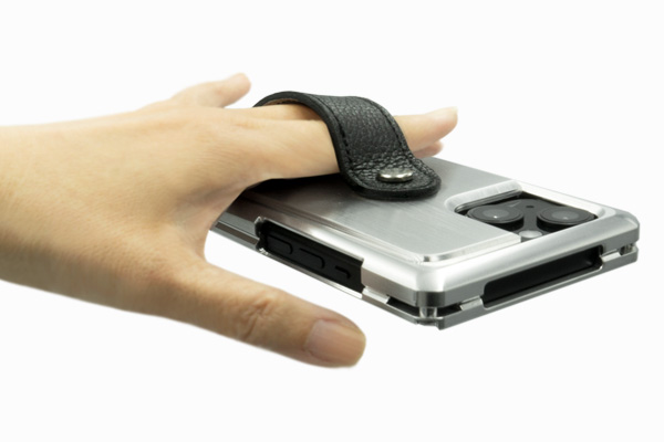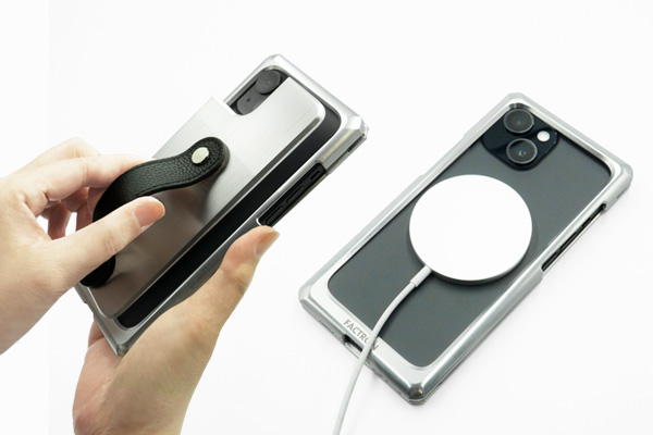 通常はフィンガーベルト付のジュラルミン削り出しジャケット(ケース)、充電時などにバックパネルをパカッと外してMagSafe チャージャーなどを取り付けられます。N52 規格の磁石を採用した弊社独自設計のバックパネル構造で、iPhone のMagsafe 規格に対応してピッタリと吸い付きます。ベルトを持って逆さに振っても外れず、でも、外したいときにはパカッと外せる絶妙な吸着加減です。
