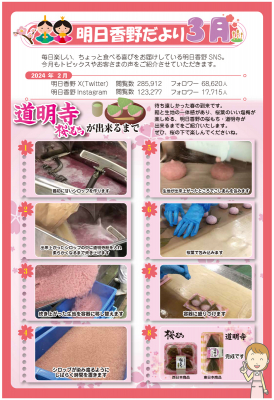 和菓子専科・明日香野が毎月発行している広報誌「明日香野だより」は、明日香野とお取引いただいている関係者様にその時期にあった明日香野関係のニュースをお知らせしています。