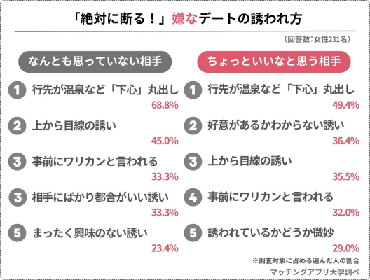「なんとも思っていない男性」と「ちょっといいなと思う男性」ともに、ワースト1位は「行先が温泉・ホテルなど下心丸出しのデートに誘われる」となりました。また、「行く?会う?など上から目線で誘われる」と「行く前にワリカンと言われる」がどちらもワースト5にランクインしました。理由を詳しくみてみましょう。