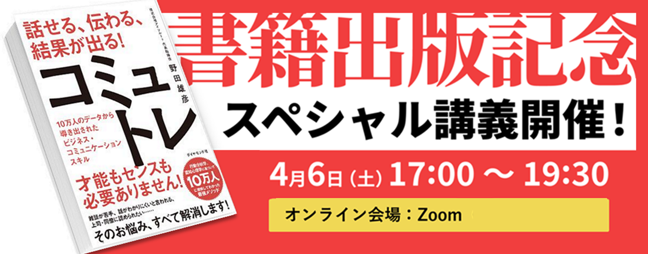 株式会社アイソルート(本社:東京都渋谷区、代表取締役:野田 雄彦)が展開する実践形式のビジネススキル・スクール「コミュトレ」は4月6日(土)に「書籍出版記念!特別講義」を開催することをお知らせします。