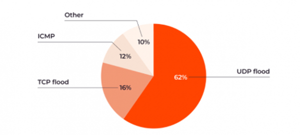 ● UDP フラッドが DDoS アタックの62%と、上半期と同様の最多を占めた。TCP フラッドは16%、 ICMP アタックは12%、SYN、SYN+ACK と RST フラッドの合計が10%に着地し、SYN フラッドは低位に下落した。