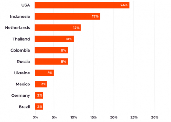 脅威元となる国々は、全世界の広範囲にわたります。上位3国には米国、インドネシア、オランダ、下位3国にはメキシコ、ドイツ、ブラジルがランクされました。