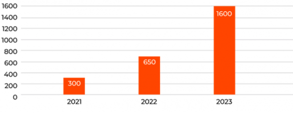 ● 2021年は 300 Gbps、2022年は650 Gbps(https://gcore.com/news/650-gbps-ddos-attack/)、2023年上半期は800 Gbps(https://gcore.com/news/500-million-pps-ddos-attack-in-2023/)に達していた。過去3年間の増加は年率100%を超えた。また、この上昇傾向は2024年にも継続すると Gcore では予測している。