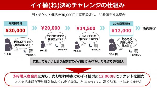 「イイ値(ね)」が支払ってもいいと思う金額まで下がった時点で予約購入手続きをしていただければ、チケットの入手が確定します。