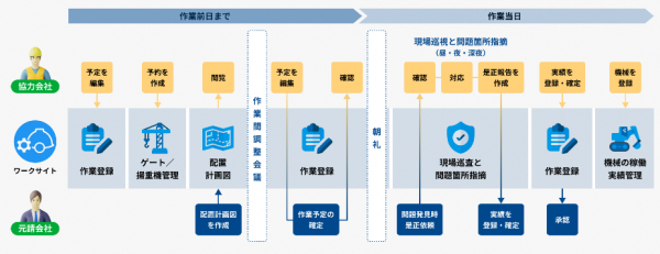 ※「ワークサイトを使った1日の業務の流れ」株式会社MCデータプラス「建設サイト・シリーズ」https://www.kensetsu-site.com/series/worksite/より引用